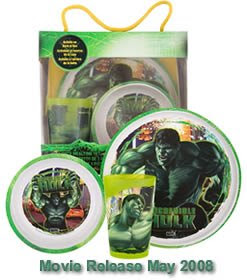Zak! Designs has revealed its line-up of products for The Incredible Hulk and Iron Man movies, including lunch kids and dinnerware. In the second "Hulk" pic, it says "May 2008," but the movie actually comes out in June, of course. In related news, Marvel.com has posted 9 Iron Man movie wallpapers that you can download.