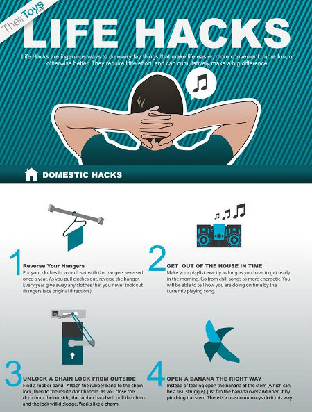 Finally, an infographic that might actually change my life. Granted it won't, but still, it could. I mean, if I weren't such a deadbeat. How about number one there, the hanger idea -- that's pretty good, right? Well it would be if all my clothes weren't in a pile on the bathroom floor. I call it my nest, and it's where I sleep at night. Bathmat pillow aside, don't you dare judge me. I don't judge you, do I? Yes, I do actually, I'm very judgey. Anyway, read the graphic, learn some shit, then get out there and get life hacking! But a word of warning: don't go overboard, bricking = certain death.