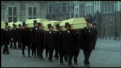 Herzong devotes a good 10-15 minutes exclusively to the effects of the plague. One great sequence shows a massive cortege of hundreds of coffins being carried through a town square. Thousands are dead, and the ones who are living but are afflicted throw a delirious party in the streets.