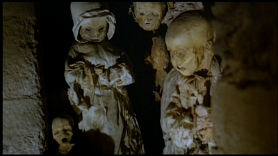The first series of shots in this film are completely appalling but it takes a few seconds for the realization of what you're looking at to sink in. They look like old mottled puppets. That the first few you see are small reinforces this appearance. Then you see one that's much taller, and it's naked and its genitals are moldy and misshapen. And that's when it dawns on you that what you're looking at is a roomful of petrified corpses -- and those first few are kids. The one on the left appears to be an infant. Ladies and gentlemen, Werner Herzog* would like you to know he's not fucking around.