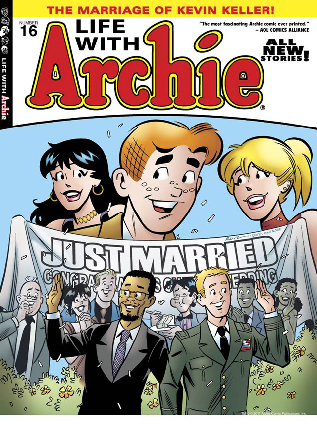 A year after introducing Riverdale’s first gay character, Kevin Keller, Archie Comics is showing his marriage to an African-American physical therapist named Clay Walker. The issue with their wedding, "Life with Archie #16," debuts at comic book stores January 4 and newsstands January 10.