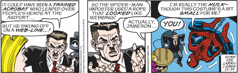 Oy! Spidey mentioned the Hulk again! Well, at least he dosen't have to break a steel door this time. Lol Jameson is like "what the heck" in the third panel of the second strip.