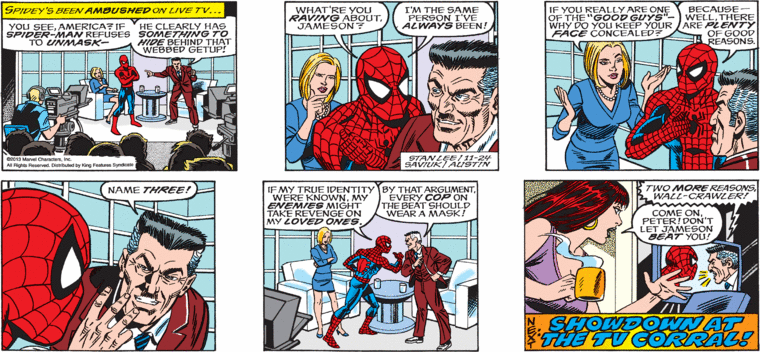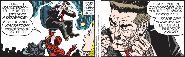 Why does J Jonah Jameson get to just demand 3 reasons? Spidey should just say "because shut up that's why" and web his predictable mouth shut again.