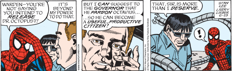 I wish the story would end today with Doc O. being released and Spider-Man being put in cuffs for breaking into the jail.
