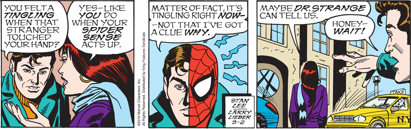 I think it's funny that after 40 years of this strip we still need to be reminded that Peter is Spider-Man with that split-face image. We get it!